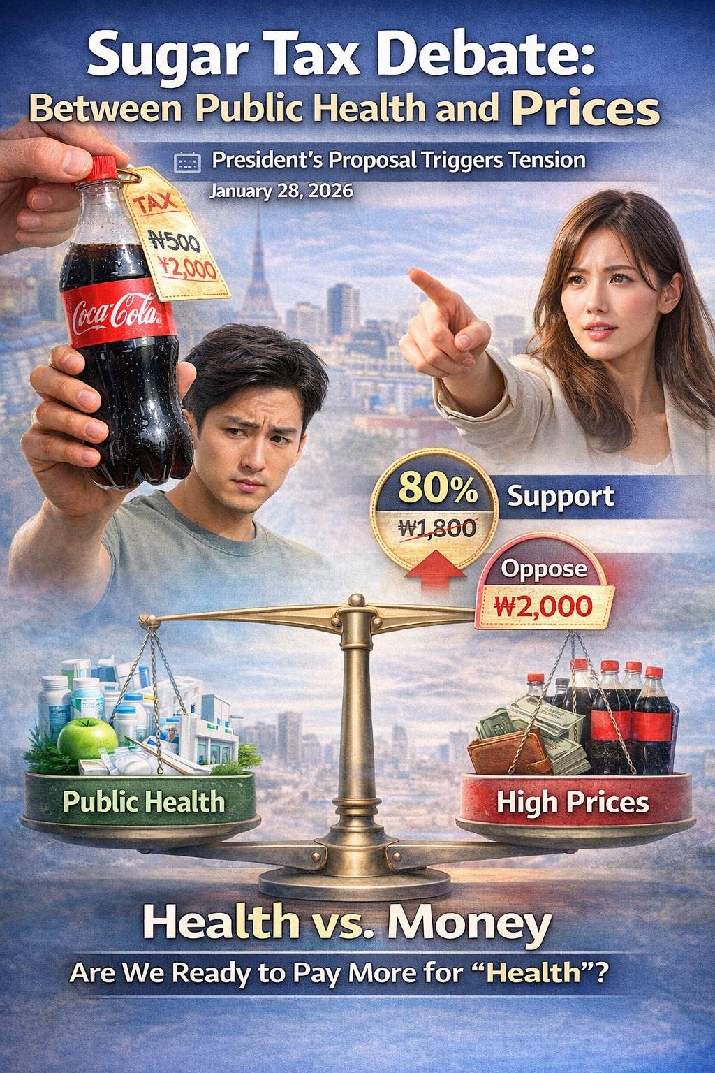 설탕세 논쟁, 국민 건강과 물가 사이에서 2026년 1월 28일, 이재명 대통령의 SNS 발언 하나가 식품업계와 소비자들을 긴장시키고 있습니다. "담배처럼 설탕 부담금으로 설탕 사용을 억제하고, 그 부담금으로 지역·공공 의료 강화에 재투자하는 방안은 어떤가"라는 제안이었습니다. 국민 80% 이상이 찬성한다는 여론조사 결과와 함께 공유된 이 발언은 즉각 설탕세 도입 논쟁을 촉발했습니다. 청와대는 "의견 수렴 단계"라고 선을 그었지만, 이미 편의점 진열대의 탄산음료 가격표부터 흔들리기 시작했습니다. 과연 우리는 건강을 위해 더 비싼 콜라를 마실 준비가 되어 있을까요? 이 질문 앞에서 찬성과 반대가 첨예하게 맞서고 있습니다.1. 설탕세를 둘러싼 다층적 쟁점들 (1) 설탕세란 무엇이며, 왜 지금 논의되는가..