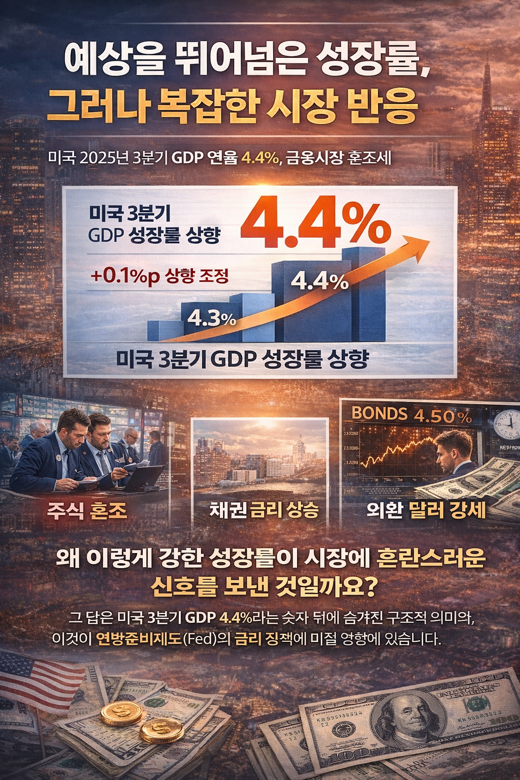 예상을 뛰어넘은 성장률, 그러나 복잡한 시장 반응 2025년 말, 미국 경제분석국(BEA)이 2025년 3분기 실질 국내총생산(GDP) 증가율을 연율 4.4%로 발표하면서 글로벌 금융시장에 상당한 파장을 일으켰습니다. 이는 초기 발표된 속보치 4.3% 대비 0.1% 포인트 상향 조정된 수치로, 2년 만에 가장 높은 성장률을 기록한 것입니다. 겉으로 보기에는 매우 긍정적인 지표이지만, 시장의 반응은 단순히 환호로만 끝나지 않았습니다. 주식시장과 채권시장, 외환시장이 각기 다른 방향으로 움직였으며, 투자자들은 이 지표가 향후 통화정책에 미칠 영향을 두고 복잡한 계산에 들어갔습니다. 왜 이렇게 강한 성장률 발표가 시장에 혼란스러운 신호를 보낸 것일까요? 그 답은 미국 3분기 GDP 4.4%라는 숫자 뒤에 숨..