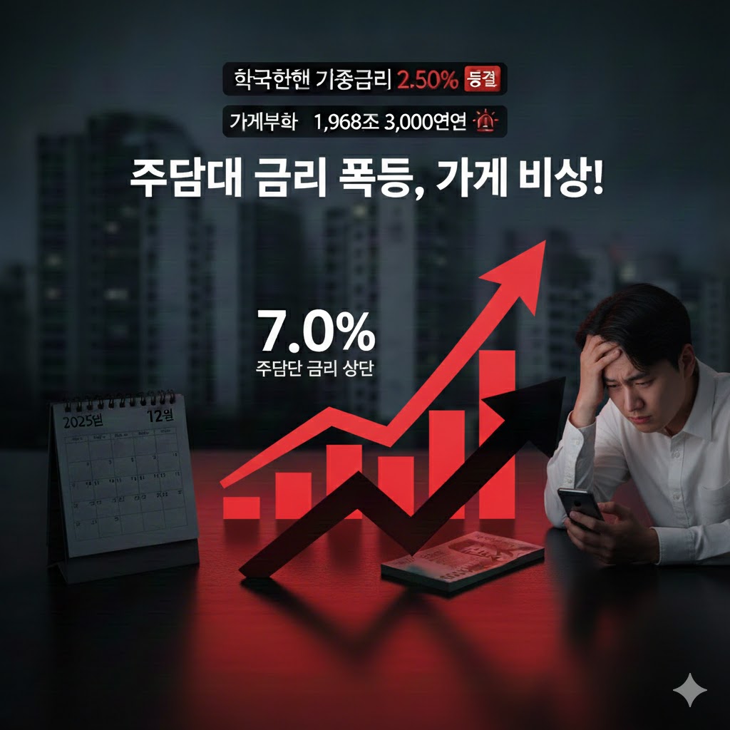 주담대 금리 7% 시대 임박, 가계 이자 부담 급증 주담대 금리 7% 시대 임박이 현실화되고 있습니다. 2025년 12월 현재 5대 시중은행의 주택담보대출 변동금리가 연 3.63~6.43%를 기록하며 상단이 6%대를 돌파했고, 일부 은행의 변동금리 상품은 이미 7%를 넘어섰습니다. 한국은행은 기준금리를 2.50%로 네 차례 연속 동결했지만, 가산금리 상승과 고환율 장기화로 실제 대출금리는 2년 만에 최고치를 경신했습니다. 2025년 3분기 기준 가계부채는 1,968조 3,000억 원으로 사상 최대치를 기록하며 가계부채 경고등이 켜졌습니다. (출처: 한국은행 2025년 3분기 가계신용 통계, 전국은행연합회 2025년 11월 금리 자료) 1. 주담대 금리 급등의 실체 1-1. 2025년 12월 주담대 금리..