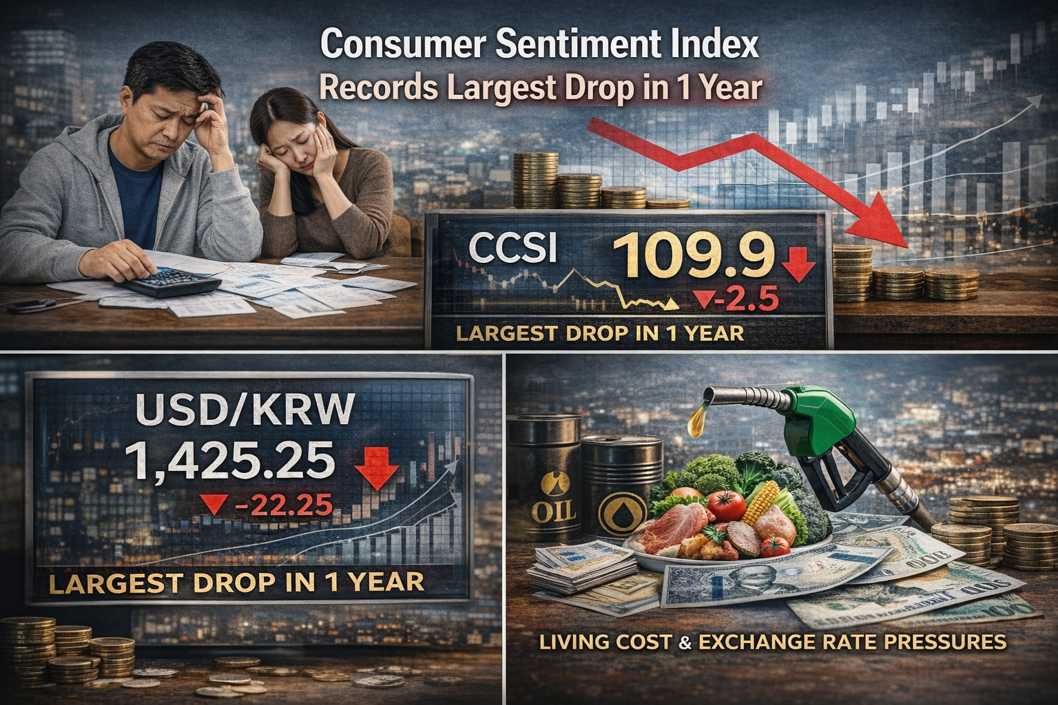 "12월 소비자심리지수 급락"은 단순한 월별 변동이 아니라, "생활비 불안"과 환율 불확실성이 복합적으로 작용한 결과로 분석됩니다. CCSI는 관세 협상 타결과 시장 예상을 웃돈 3분기 성장률 등의 영향으로 11월 2.6포인트 상승했으나, 한 달 만에 다시 하락 전환했습니다. "생활비 부담"과 환율 급등이 가계 경제를 직격 하면서 "소비심리가 얼어붙었고", 이는 내수 경기 침체로 이어질 우려가 커지고 있습니다. (출처: 한국은행 소비자동향조사, 2024년 12월 24일)